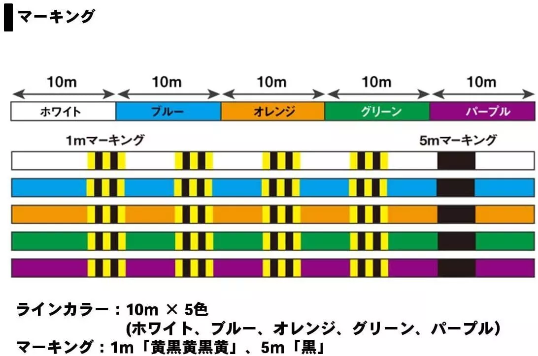 10m x 5 colors (white/ blue/ orange/ green/ purple); 1m marking (yellow/ black/ yellow/ black/ yellow); 5m marking Black